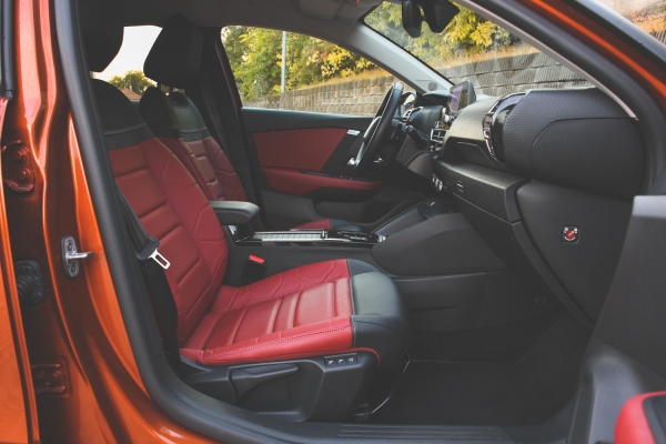 Mivel a tesztautóba belerendelték a Hype Red beltérhangulat csomagot, igazi szín és anyag kavalkád kerekedett odabent – még az ízlésességen belül, ami valahol az ajtókárpiton egyesült igazán: a Peugeot modellekből is ismert kellemes műanyag elemeket jelen esetben velúrral és vörös műbőrrel törték, utóbbin ráadásul a Citroen logóra emlékeztető varrással. Egyébként minden apró részleten visszaköszön a chevron jelvény, legyen az a rádió tekerője, vagy éppen a műszerfal puha borítása.