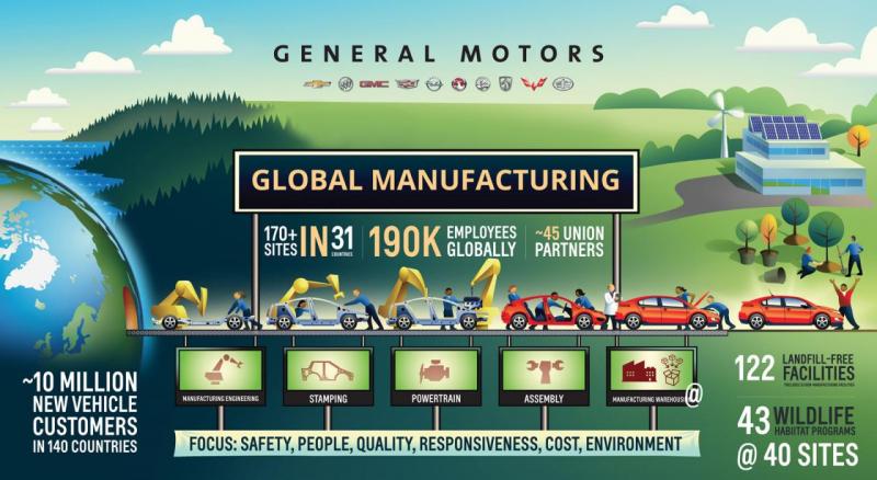 2009 óta a General Motors 36,7 milliárd dollárt fektetett be a létesítményeibe világszerte, ebből 16,8 milliárdot az Egyesült Államokban. Utóbbival 3650 új munkahelyet hoztak létre az országban, és 20700 másikat szilárdítottak meg. A következő három évben a cég 5,4 milliárd dollárt költ majd az újgenerációs járművek kifejlesztésére és gyártásának előkészítésére az Egyesült Államokban. Jelenleg a General Motors több mint 170 gyárral és 190 ezer alkalmazottal rendelkezik világszerte.