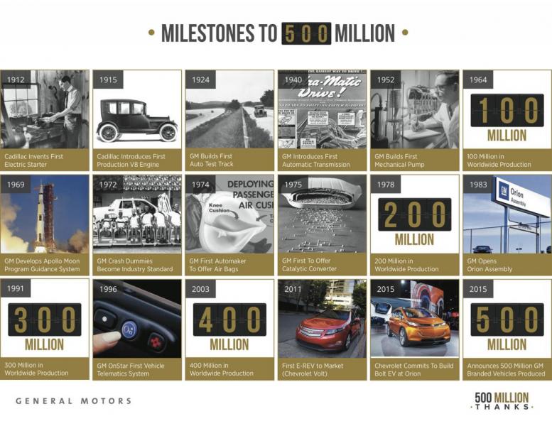 A General Motors bejelentette, hogy az összes márkája már összesen több mint 500 millió autót gyártott le a cég történetének 106 éve alatt. A jubileumi autó típusát nem hozták nyilvánosságra. A kerek szám elérését a General Motors fairfaxi (Kansas állam) gyárában Mary Barra vezérigazgató és Alan Batey észak-amerikai elnök jelenlétében ünnepelték meg. A rendezvényen egy iraki veterán katonának ajándékoztak egy 2016-os modellévú Chavrolet Malibut, és arra is felhívták a figyelmet, hogy az első, szériaautóba épített V8-as motor, automatikus váltó és légzsák is a cég nevéhez kötődik.