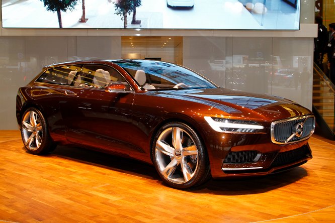 Volvo - A Volvo új kombi tanulmánya, a Concept Estate az új XC90 és a következő V70 előfutára. Már az új, moduláris, rugalmasan alakítható SPA platformjára épül, később minden új szériagyártású Volvo ezt kapja a V40 fölött.. A Concept Estate elegáns külsejénél is izgalmasabb a belseje, amely nagyon hasonló lesz a közeljövő szériagyártású Volvóiban. Egy hatalmas táblagép foglalja el a középkonzolt, fizikai gombokból csak egy sort alakítottak ki, a képernyő alatt. Az összes fontos funkciót az érintőképernyőn lehet irányítani, a légkondicionálástól a navigációig. A természetes fával, gyapjúval, bőrrel és fémmel burkolt belső teret a skandináv nappalik ihlették, a biztonsági övek narancssárga színűek. Csak négy ülést helyeztek el a kocsiban, melyek közül a hátsók ledönthetők.