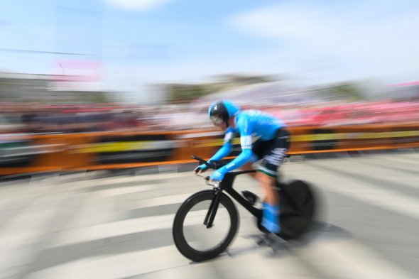Az olasz Alessandro de Marchi a 105. Giro d’Italia országúti kerékpáros körverseny második szakaszán, az egyéni időfutamon a Hősök terén 2022. május 7-én (Fotó: MTI/Illyés Tibor)