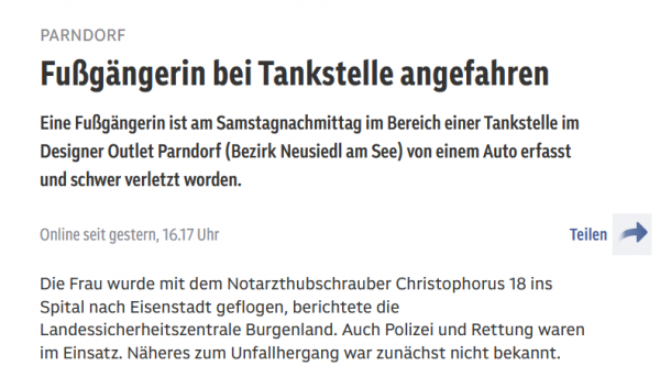 Egy gyalogost elütött egy autó, és súlyosan megsérült szombat délután a Designer Outlet Parndorfban (Neusiedl am See kerület) egy benzinkút közelében. Itt naponta több ezer magyar fordul meg, a határ közelében ez a legnagyobb bevásárlóközpont.