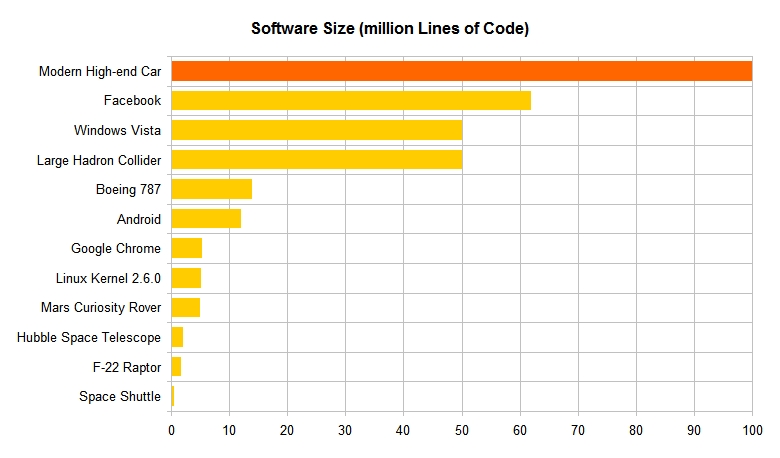Unalomig elcsépelten hangozhat már, hogy az autók milyen sokat fejlődtek az elmúlt 20 évben, ezért kigyűjtöttünk néhány adatot, amivel szemléltethető, hogy hol is tart ma a járműipar. Talán elsőként érdemes megemlíteni a járművekben található saját logikával rendelkező elektronikus egységek (ECU-k) számát. Egy, a gyártósorról ma legördülő autóban minimum 40, de egy prémium kategóriába tartozó, gazdagon felszerelt autóban akár 150 vezérlő is lehet. Ezekbe a vezérlőkbe mintegy 100 millió sor programkódot írtak a szoftverfejlesztők. Ez a szám majdnem 20-szorosa egy modern repülőgép, például a Boeing 787 Dreamliner programsor-számának. De a Windows és az Android operációs rendszerek programkódjai sem tartalmaznak annyi sort, mint egy mai autó vezérlői.