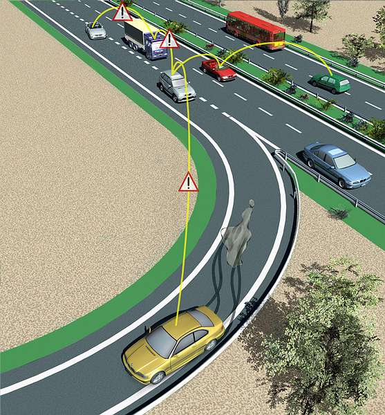 A járművek közötti kommunikáció egyértelmű előnye, hogy tudjuk figyelmeztetni a többieket egy forgalmi akadályra, valamilyen veszélyre, a saját járművünk problémájára vagy az útburkolat hibájára, és mindehhez nekünk semmilyen erőfeszítést nem kell tennünk.