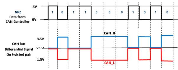 A CAN hálózat szimmetrikus jelátvitelt alkalmaz, amelyet a gyakorlatban csavart réz vezető érpárral kerül kialakításra (CAN-High és CAN-Low vezeték). Lehet árnyékolt kivitelben is készíteni, így nagyobb a zavarvédelem, tehát nagyobb átviteli sebesség és adatbiztonság érhető el. A jeldetektálás differenciális feszültségmérésen alapul, és NRZ (nullára nem visszatérő, non-return to zero) kódolást használ. A High és Low vezetékek között mért feszültségkülönbség 2 értéket vehet fel, így alakítható át bináris jelalakká: az egyik érték a digitális 0-t, a másik pedig az 1-et jelenti.
