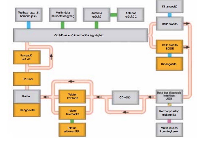A MOST-kommunikáció tehát remekül kiszolgálja a szórakoztató és a komfort elektronikát, bár a csillag topológia miatt egy egység meghibásodása miatt a teljes kör működésképtelenné válik, a hiba feltárása pedig hosszadalmas lehet.