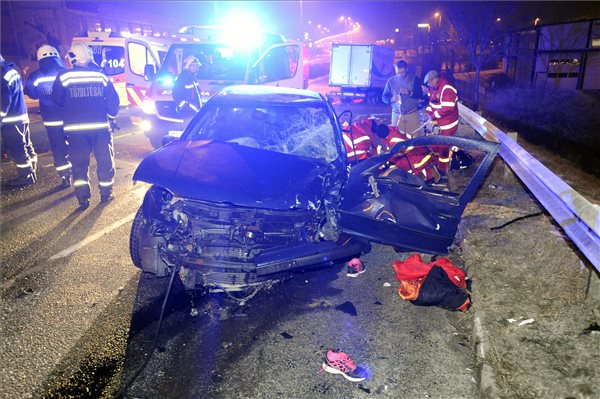 Mentők és tűzoltók dolgoznak egy összeroncsolódott személyautó mellett az M5-ös autópálya Határ úti felüljárójánál 2017. január 20-án.