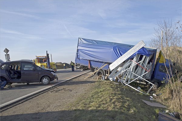 Összetört teherautó és személygépkocsi Albertirsa határában, miután összeütköztek a 4-es számú főúton 2017. november 15-én. A balesetben a személyautó vezetője életét vesztette. MTI Fotó: Lakatos Péter