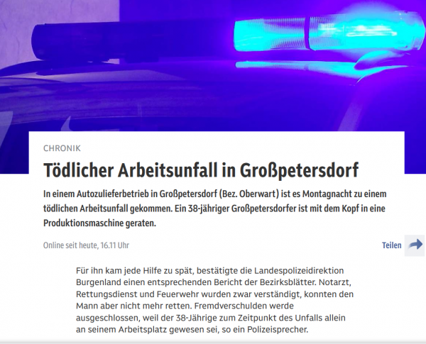 Az orf.at nem tér ki arra, hogy melyik autóipari beszállítónál történt a tragédia.