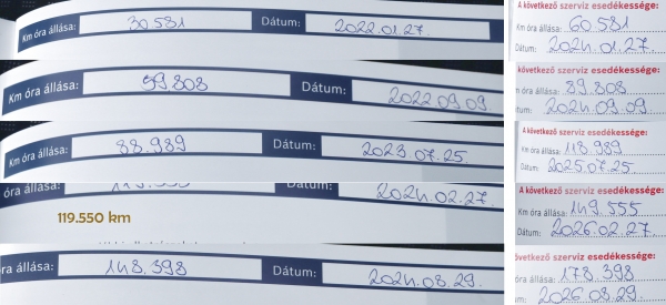 Ennek a kivitelnek hosszú szervizintervalluma van, 30.000 km vagy egy év. Ebből a brutális futás miatt mindig a kilométer következett el előbb, így 30, 59, 89, 119 és 148 ezer kilométernél olajat, olajszűrőt, levegő és pollenszűrőt cseréltek benne, illetve a 119.000-es beavatkozásnál gázolajszűrőt is kapott. Csakhogy nem márkaszervizben, hanem egy független szervizhálózatnál csinálták ezeket a karbantartásokat, ráadásul jól látható, hogy a szervizkönyvet nem folyamatosan, hanem most, eladás előtt töltötték ki: Tök újszerű a füzetke állapota, a kézírás pedig mindig ugyanaz, pecsét sehol sincsen.