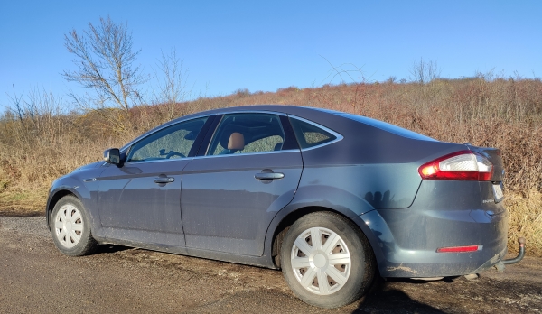 Véleményem szerint nem hétköznapi a forma, főleg, ha a bevezetés időpontját, tehát 2007-et nézzük. Míg a Passat a konzervatívabb vonalat vitte, addig az Insignia a saját útján járt, tehát a Mondeo ezen generációja amíg nem volt az utcakép része, egy elég sportos, és jó kiállású szedán volt. Tudom, hogy nem csak ezzel a két konkurenssel kellett megküzdenie, de sokat vetett a latba a merész design (főleg a facelift krómos „busa szájával”), illetve a letaglózó méretek, és nem utolsó sorban az árazás, na meg az ötcsillagos törésteszt. Megpillantva a járművet, rögtön látszik, hogy nem alapkivitellel lesz dolgom: szép színe lenne az autónak, de sajnos sem az időjárási körülmények (sónedves, párás, saras volt minden), sem a benapozás nem volt segítségemre abban, hogy ezt meg tudjam mutatni. A külső után menjünk már közelebb, és foglaljunk végre helyet. De előtte még meg kell fogni a kilincset, ki kell nyitni, majd be kell csukni az ajtót. Első benyomás, hogy elférne még benne az anyag, messze van a trezor érzettől, de tudom, kezeljük helyén.