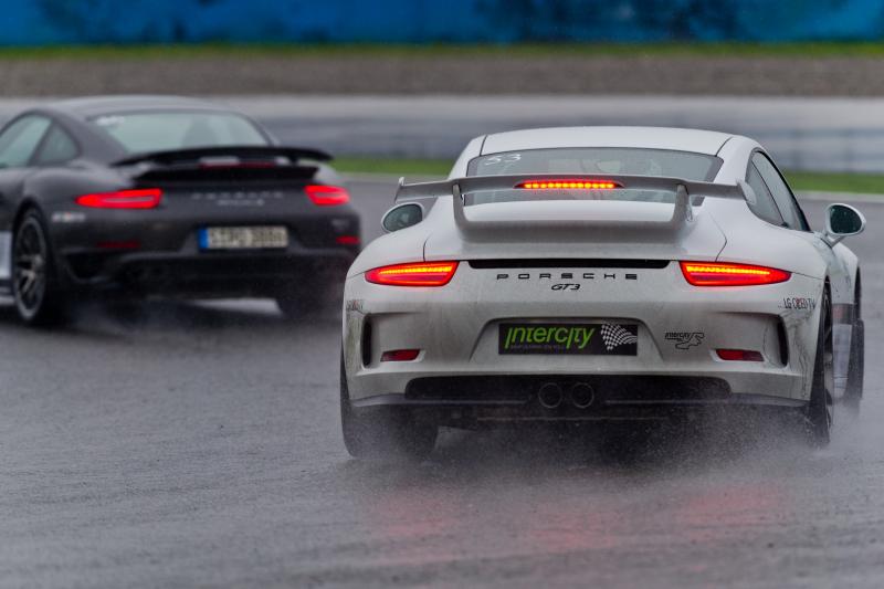 Négy-öt körönként autót váltottunk, de én már az első órákban elvesztettem a fonalat, az azonban biztos, hogy a teljes Porsche kínálatot vezethettük, az első nap délutánján ráadásul esős pályán is, ahol a PSM-nek köszönhetően a határozottan farnehéz 911-es is kezesbárányként viselkedett. A sokadik kör után pedig már nagyon biztosnak éreztem a kormányforgatást.
