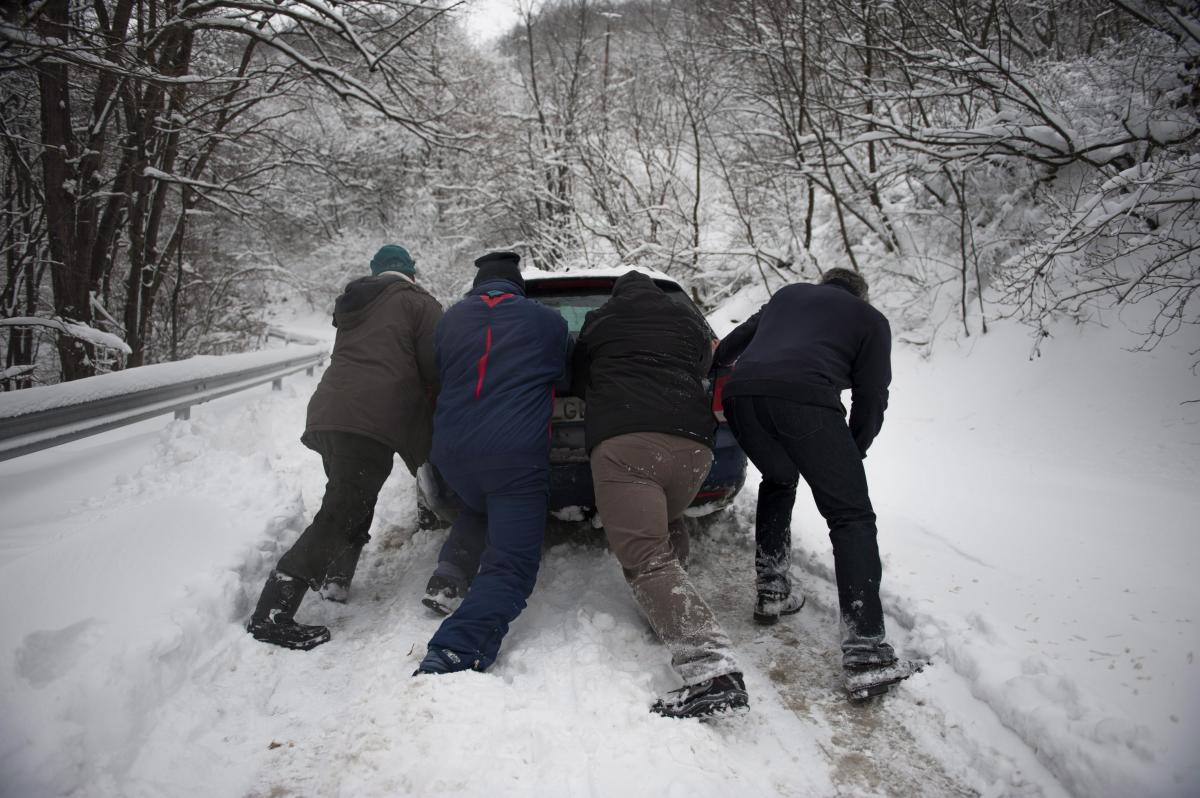 A havas úton elakadt autót tolnak a Mecsekben, Pécs közelében 2013. január 25-én.