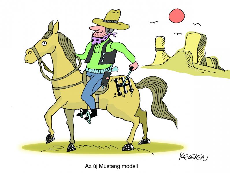 E heti rajzunk készítője Kelemen István, karikatúrájának címe: Az új Mustang modell.