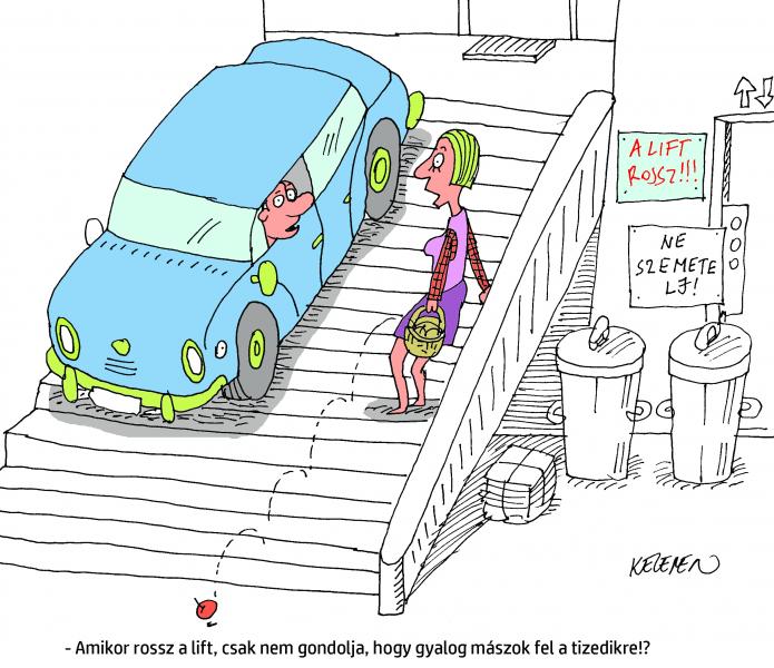 E heti rajzunk készítője Kelemen István, karikatúrájának címe:Ha rossz a lift.