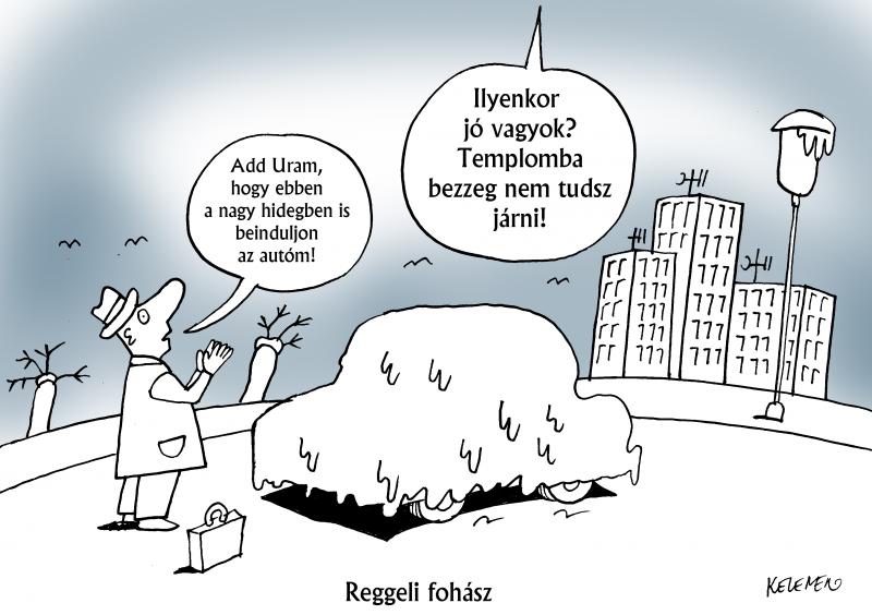 E heti rajzunk készítője Kelemen István, karikatúrájának címe: Reggeli fohász.