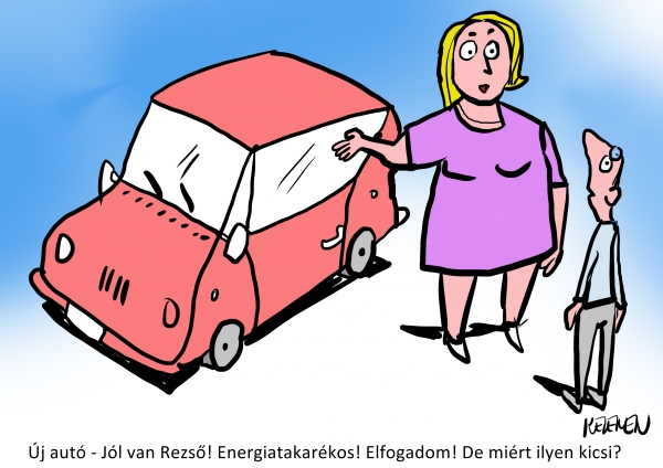 Heti rajzunk készítője Kelemen István, karikatúrájának címe: Új autó, de miért ilyen kicsi?