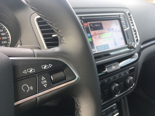 Az Alhambra egyértelműen jobban néz ki, igazi buszlimuzin, személyautós kényelemmel, hatalmas térrel, egyszerű és unalmas belsővel és elektromosan nyitható oldalsó tolóajtókkal. Az üléspocízió magas, a kormány több síkban állítható, a kapcsolók kézre esnek, az ergonómia példás. Az utastér jól áttekinthető, az Alhambra nagy méretei ellenére könnyen irányítható. Kivéve szűk helyeken, ott nehéz manőverezni vele, mert a jobb eleje nagyon távolinak tűnik. A parkolásban kamera és radarok segítenek, önálló parkolásra is képes az autó – már, akinek van ideje kivárni. A Style felszereltség elég gazdag ellátmányt sorol: USB-csatlakozóból hátul kettő van, de ezek csak töltésre alkalmasak, a telefont a könyöklőben található aljzaton át lehet tükrözni, az Apple CarPlay simán fut, a Waze is megjeleníthető a középkonzol érintőképernyőjén. Bár csak 800 kilométer volt a tesztautóban az egyik utamon elsötétült a képernyő és nem működött a szórakoztató- és információs egység, csak nyöszörgött, zörgött és néha megszólalt a rádió, de irányítani nem lehetett. Fél óra pihentetés után visszajött a kép és a hang is. Halleluja! Korábban ilyen problémával csak a PSA, a Volvo, a Lancia, a Renault és az Opel termékeiben találkoztam, úgy látszik a beszállítói lánc változásával már a VW-csoport is érintett a lefagyásban.