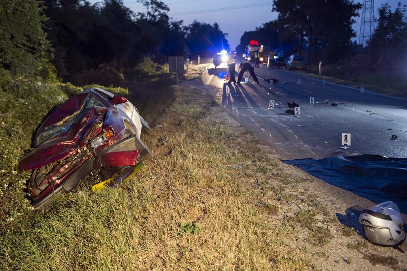Helyszínelők dolgoznak 2015. augusztus 9-én az 51-es főút majosházai szakaszán, ahol személyautó és motorkerékpár ütközött. A két jármű olyan erővel csapódott egymásnak, hogy az autó árokba borult, a motor pedig kigyulladt. A motort vezető nő és kislánya a helyszínen életét vesztette. MTI Fotó: Lakatos Péter