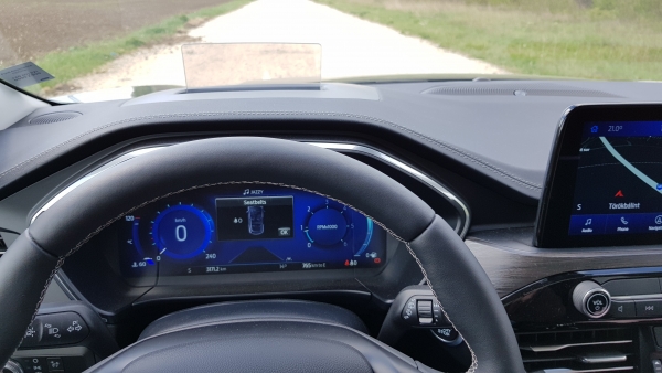 A Kuga fedélzete a már megújult fordos stílust követi, újdonság volt az autóban a tekintélyes méretű head up display. Az autó műszerfala teljesen digitális, mely egység grafikái mindig igazodik a kiválasztott a vezetési módokhoz csak úgy, mint a Pumában. Egyébként itt is több alternatívát találunk, ami gyakorlatilag az összes lehetséges útviszonyra kínál elektronikusan „beégetett” megoldást. A megszokottól eltérően a szenzorok adatai mellett a vezérlés más beállítási adatokat is módosít például a lengéscsillapító feszességét is.