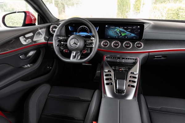 Kívülről csak az új első lökhárító, az egyedi típusjelzések, kipufogóvégek és a 20 (vagy 21) colos felnik különböztetik meg a 843 lóerős csúcsmodellt a nemrég frissített, többi négyajtós AMG GT-től.