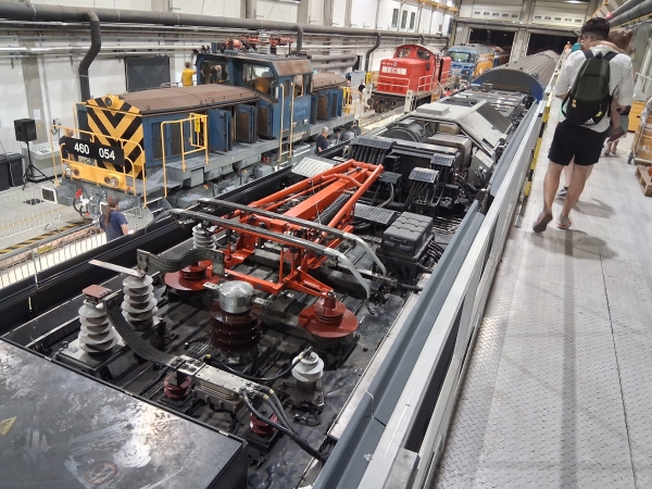 Egyet az újabb mozdonyok közül alulról, a speciális aknából is megnéztünk, minden nagyon masszív, más itt a súly, mint az autószerelő műhelyek aknáiban. Itt nem kellett védősisakot felvennem, akkor volt a szabad magasság, ám a „simább” akna fölé beálló idősebb vontató alsó megtekintéséhez már megkövetelték a szervezők a fejvédőt.