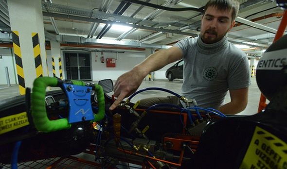 A hajtásrendszer lényege, hogy egy 100 milliméter átmérőjű, 500 milliméter lökethosszal rendelkező munkahenger lineáris mozgásából állít elő forgó mozgást, sűrített levegő segítségével. – A mechanikus szerkezet olyan jól sikerült, hogy legutóbb Kecskeméten, a Aventics Pneumobil Gálafutamon programozható vezérléssel működő járgányokat is meg-