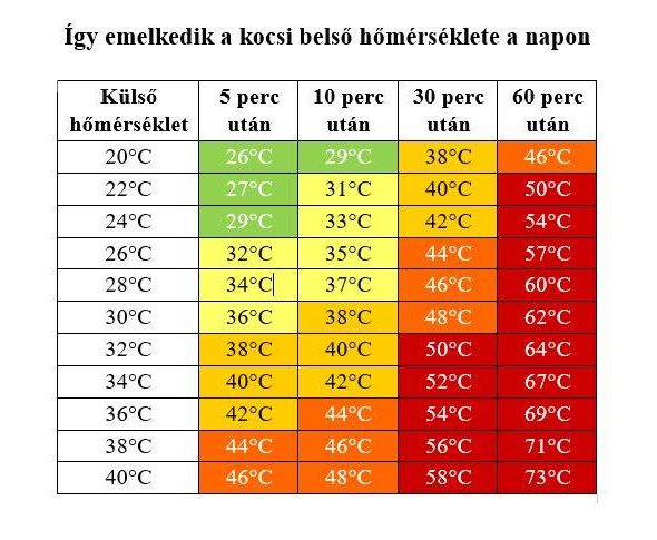 Ha a kinti hőmérséklet csupán 21 fok, az autóban akár 50 fokig is melegedhet a levegő. Kísérletek igazolták, hogy egy tűző napon álló autó belső hőmérséklete 10 perc alatt akár 11 fokkal is emelkedhet, 20 perc után pedig 16 fok is lehet a növekedés. Gondolj csak bele, mit jelent ez, amikor odakint több mint 30 fok van! Egy óra után pedig akár a 60 fokot is meghaladhatja az utastérben mért hőmérséklet.