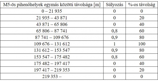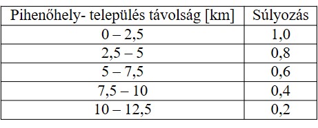 4. táblázat: A pihenőhely-település távolságok súlyozása