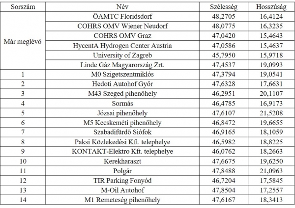 A kezdeti magas prioritású HRS pontok közül az egyik legfontosabb töltő az M0-áson elhelyezkedő pihenőhely, hiszen a Mediterrán (M7, M0, M3 autópályák) a Kelet/Kelet-Mediterrán és Rajna-Duna (M1, M0, M5 autópályák) nemzetközi közlekedési folyósokat keresztezi. Az Annahegyi pihenőhely és Szigetszentmiklós M0-ás pihenőhely közül a Budapesti Intermodális Logisztikai Központ (BILK) vonzáskörzete miatt inkább célszerűbb választás a Szigetszentmiklós M0-ás pihenőhely. Az M7-es szakasznál a Xeni's Log Nagykanizsa pihenőhely településen belül található, és több mint 1 km-t kellene letérni az autópályáról, ezért a közeli autópálya menti Sormás pihenőhely javasolt. Az M1-es útvonalon az Arrabona -és a Hedoti Autohof pihenőhely közül a Hedoti Autohof pihenőhelynél ajánlatos a HRS kiépítése, a közelben lévő autógyár és annak gyorsabb megközelíthetősége miatt. Az M5-ös szakaszon Szeged mellett az M43-as Szeged pihenőhelyet, az M3-as (M35-ös) szakaszon a Debrecen melletti, még épülő autógyár melletti pihenőhelyet javasoljuk. Ukrajnában belátható időn belül nem lesz HRS, így az ukrajnai határmentéhez nem tervez a modell.