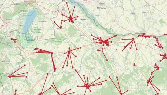 A pihenőhelyekhez tartozó települések távolsága egy további paraméter, amely a számításban szerepel. Mindegyik szakasz esetén az összes pihenőhely és az összes település egymás közötti távolságát mátrixként kaptuk meg. Elsőként kizártuk azokat a pihenőhely-település távolságokat, amelyek a számítás szempontjából nem relevánsak. Ezt a határértéket 12,5 km-nél határoztuk meg, amelyen túl már nem kapja meg a település részösszegét az adott pihenőhely. Ha 12,5 és 10 km a pihenő-település távolsága, akkor is csak a település részösszegének 20%-át kapja meg a pihenőhely. Elmondható tehát, hogy minél közelebb van a pihenőhely a településhez, annál nagyobb súllyal esik számításba a település részösszege.