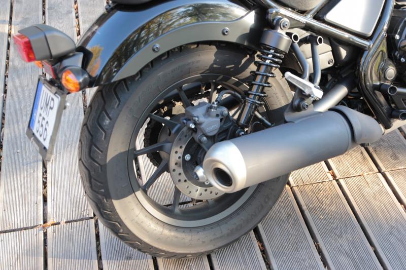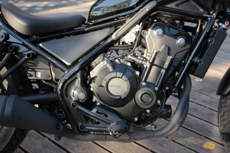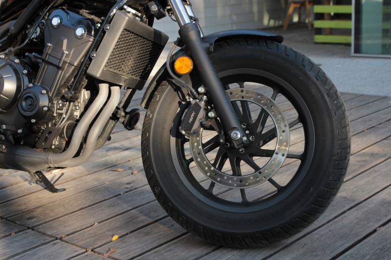 A motor maga a CBR 500-ból jött, visszafogott 46 lóerős, lapos nyomatéki görbével, 43 Nm maximummal, tűrhető menetdinamikával. A PGM-FI befecskendezőt átprogramozták a laposabb nyomatéki görbe érdekében. A járgányon nem volt semmi bonyolítás, az elektronika a benzinbefecskendezésre, a gyújtásra és a blokkolásgátlóra szorítkozott, ma ez a minimum, amivel egy motorkerékpárt el lehet adni. Ez különben nem baj, nem szeretem az agyonbonyolított szerkezeteket. Hát ez nem volt az. A széles bobberes kerekek szimpatikusak voltak, a motorblokk is bizalomgerjesztő, a többit szokni kell.