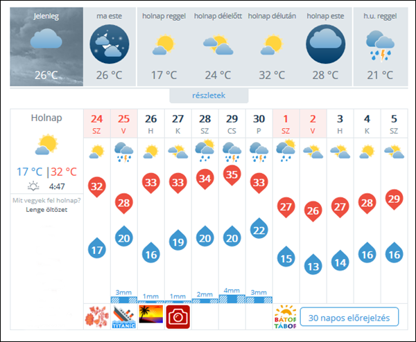 Szombaton napsütéses idő várható, csapadék nem valószínű. A legalacsonyabb hőmérséklet 14-20, a legmagasabb hőmérséklet 30-35 fok között alakul. Vasárnap ismét többfelé valószínű zápor, zivatar. Több helyen megerősödik, zivatarban viharossá fokozódik a szél is. A minimumhőmérséklet 16-22, a maximumhőmérséklet a Dunántúl északi felén 27-30, másutt 31-36 fok között valószínű - olvasható az előrejelzésben.