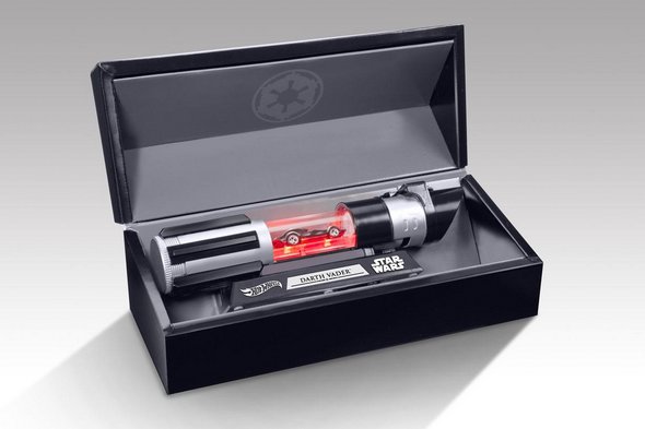 A vásáron az 1:64-es méretarányú autót 40 dollárért árulják egy díszdobozban, a kocsit a piros lézerkard markolatába rejtették.