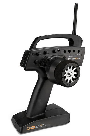 Természetesen modellünket modern, 2.4 GHz, zavarás-mentes, rádióadó és vevő páros segítségével, úgynevezett pisztoly-távval tudjuk irányítani. Funkcióit tekintve beépített failsafe érdemel említést, ez egy esetleges jelvesztés (pl: lemerül a távirányító) esetén autónk biztonságos megállásáról gondoskodik. Ezt csak az tudja nagyra értékelni, aki futott már elszabadult, irányíthatatlan modellautó után árkon és bokron át! A távirányító működtetéséhez 4 darab AA méretű elem szükséges.