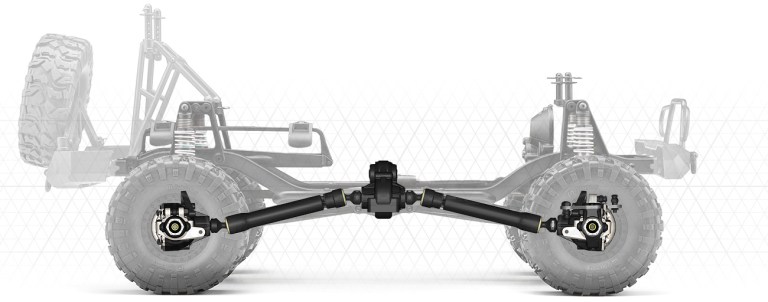Az élethű, olajjal töltött lengéscsillapítók, a zárt differenciálmű, (melynek fedlapja fém és festhető, vagy fel is polírozható, hogy teljesen egyedivé tehessük a modellt), illetve a valódi terep-gumiabroncsok magabiztosságot kölcsönöznek a modell számára bármilyen off-road körülmény között.