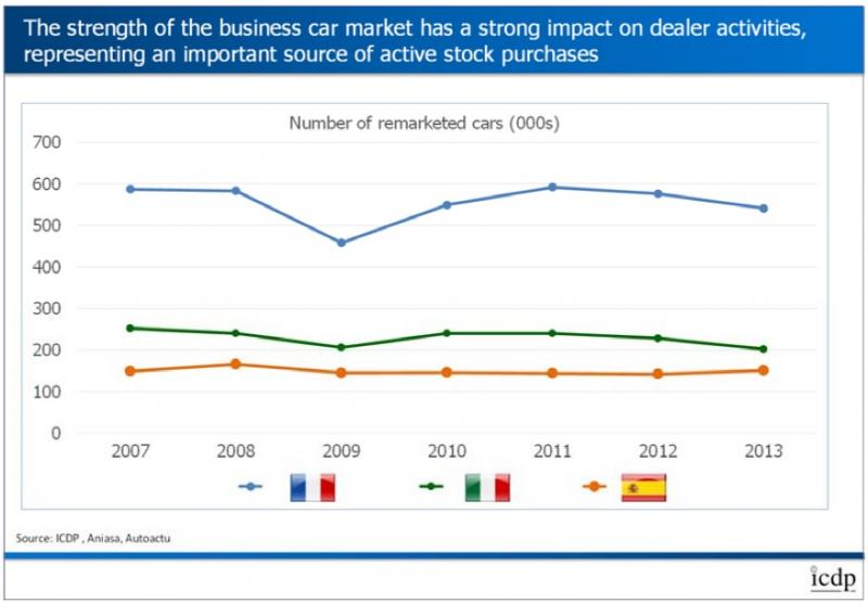 Fenti ábra az újraértékesített gépjármű volumenek alakulását mutatja 2007-2013 között Franciaországban, Olaszországban és Spanyolországban. A vizsgálatban szereplő gépjárművek bérautóként rótták az utakat, vagy éppen kifutó lízingszerződésük miatt kerültek eladásra. Általánosságban elmondható, hogy míg az újautó értékesítés ebben az időszakban (beleértve a 2008-tól begyűrűző gazdasági recessziót) viharosan változó teljesítményt produkált, addig az ismételt értékesítés nagyjából stabilan alakult. Ugyanakkor az is látszik, hogy az egyes országokban az értékesítési teljesítmények óriási eltérést mutatnak. Míg Franciaországban éves szinten félmillió használtautó talál új gazdát, addig Olaszországban ez a szán csupán 200 ezer, Spanyolországban pedig csak 150 ezer. Sajnos ez az adatsor Németországra és az Egyesült Királyságra nem áll rendelkezésre, de az ICDP kutatói úgy sejtik, hogy ezek az országok még a francia volument is túlszárnyalják, köszönhetően a rendkívül erős flottagépjármű szektoruknak.
