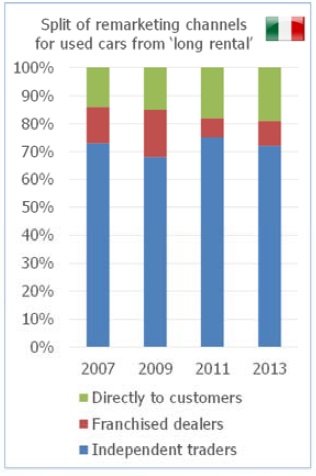 A következő diagram Olaszország példáján keresztül azt mutatja, be, hogyan alakult a remarketing csatornák teljesítménye az ex-flottás autók esetében 2007-2013 között. A közvetlenül a vásárlóknak értékesített használt gépjárművek aránya a 2007-es 15%-ról 2013-ra 20%-os szintre emelkedett. Az önálló kereskedéseknek értékesített volument továbbra is folyamatosan 70% körüli szinten mozog, míg a franchise kereskedőkön keresztül értékesített autók aránya 10% alatt marad. Azaz míg az olasz kereskedők növelték a hosszú távú bérletieseken keresztüli beszerzéseiket, a többieknek is maradt bőven értékesítési potenciál.