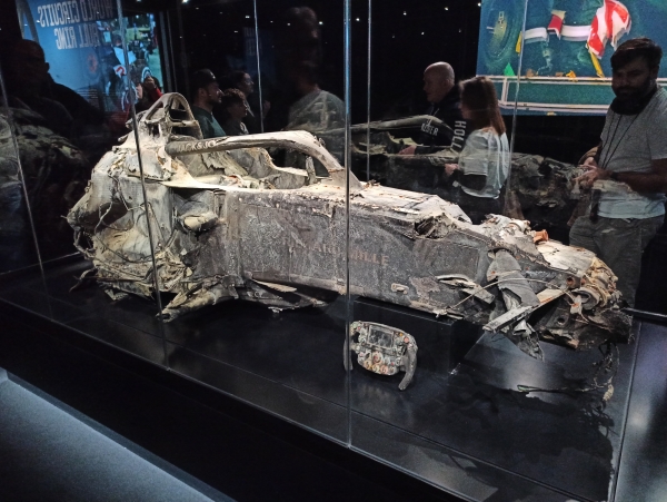 Azt viszont elmesélhetem, hiszen a kiállítást is ezzel reklámozzák, hogy a leghatásosabb terem mindenféleképp Romain Grosjain összeégett autójának kiállítása. A háttérben vetítik az esetet, a fülünkben halljuk a legtaglózó zenét és hanghatásokat, miközben látjuk, ahogy az évtizedek alatt fejlesztett biztonsági megoldások még egy ilyen becsapódástól is megmentették a francia pilótát. Hangtalanul, hosszú percekig jártam körbe a Haas maradék részét, amibe beleégtek még a matricák is. Őszintén lesokkolt, erre nem lehet felkészülni.