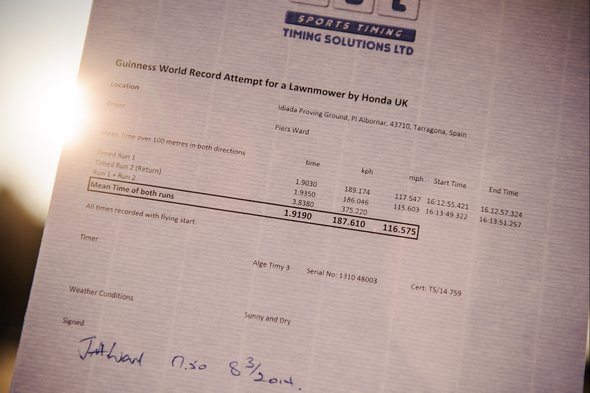 A Guinness által márciusban hitelesített világrekord szerint a Honda Mean Mower fűnyíró 187,6 km/h-s átlagot ért el egy lezárt tesztpályán Tarragonában, Spanyolországban, ezzel több mint 45 km/h-val döntötte meg a korábbi világrekordot. A Guinness szabályai szerint a pályán mindkét irányban kellett egyszer menni egy órán belül, és a két futás sebességét átlagolták.
