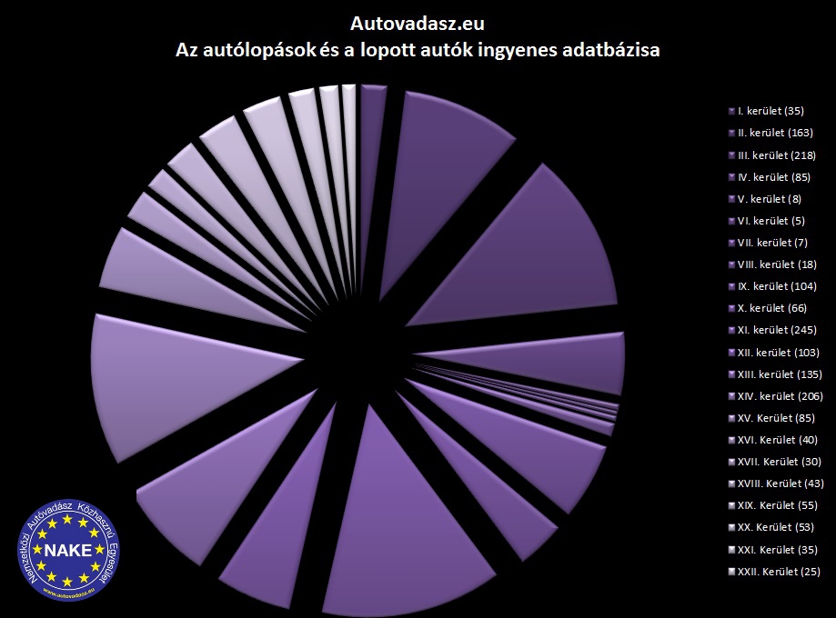 Szembetűnő, hogy amíg a 2012-es éves statisztikában a III., II., XIV. és XI. kerület a sorrend, addig az összes bejelentést figyelembe véve ez XI.,III.,XIV. és II. kerületre változik. Tehát az első négy kerület ugyanaz marad, csak más helyen állnak. Úgyhogy ezekben a kerületekben különösen óvatosnak kell lennünk, mert itt az autótolvajok folyamatosan kifejtik áldatlan tevékenységüket.