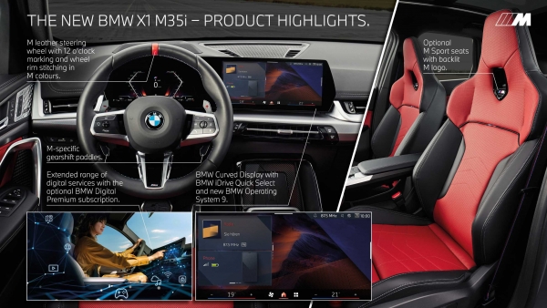 Az új BMW X1 M35i xDrive rendkívül sportos adottságai a karosszéria formanyelvében és az utastérben is visszaköszönnek: a csúcsmodell olyan exkluzív stílusjegyekkel és felszereltségi tételekkel érkezik meg az utakra, amelyek eredetileg a BMW M GmbH nagyteljesítményű sportautóinak sajátjai. Ilyenek többek között a kipufogórendszer dupla ikervégződései és a világító M logóval ellátott BMW M sportülések is.