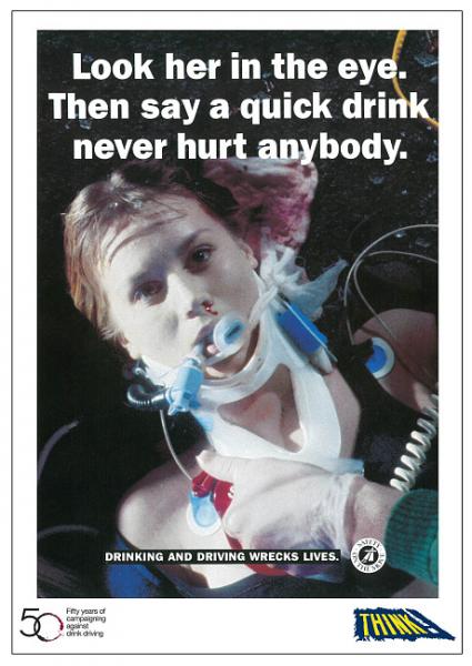 A mai trendekkel ellentétben, ahol inkább a sokkhatásra helyezik a hangsúlyt, az említett spot egyszerű és informatív. A grafika beszédes, és egy kommentátor cseppet sem fenyegető hangon sorolja: 4 pohár whisky (mi más?) esetén a baleseti kockázat kétszeres, 6 pohár esetén hatszoros, 8 pohárnál huszonötszörös.