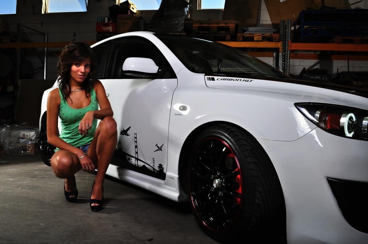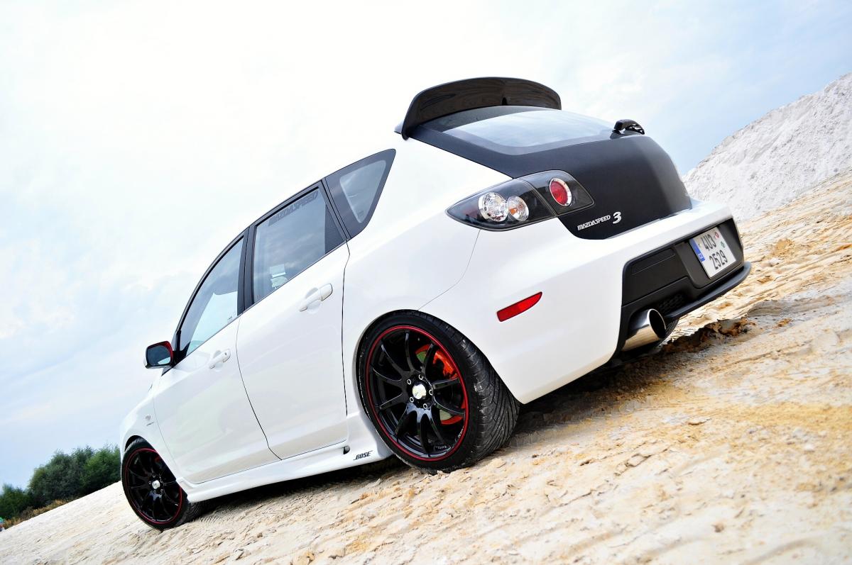 Először csak egy kényelmes 17-es alufelni, karbon hűtőmaszk, szellőzők és szárny kerültek az autóra, majd az évek során apránként, de mind többet alakult a gépezet. Előre a 2010-es modell ráncfelvarrott lökhárítója került, hátulra pedig az Mazdaspeed diffúzoros eleme, egy jókora krómvég társaságában. A két gyári elemet vizuálisan hibátlanul összekötő küszöbök amerikából érkeztek, a külcsínt pedig a karbonozott felületek dobják fel, beleértve a tetőt, motorháztetőt, hátsó ajtót és a tükörkonzolokat. Ugyanebben az évben a kasztni színe is változott: a gyári pezsgő helyét világos gyöngyházfehér fényezés vette át.
