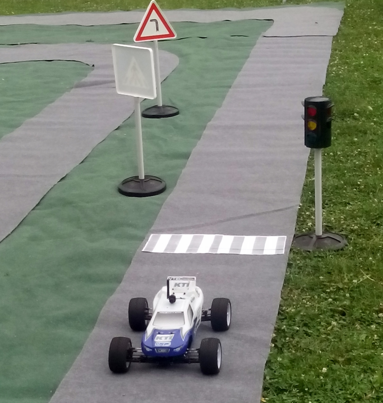 Távirányítású versenyautó robog a zánkai versenypályán. Fűre lépni elkerülhetetlen...