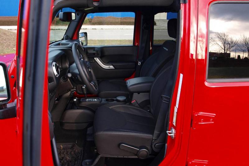 Nem a mai kor szülötte az ajtók külső zsanérozása. Megmosolyogtató, de a praktikumot szolgálja. Ezt a Wranglert ugyanis alaposan le lehet csupaszítani. A műanyagból készült tetőt szerszámok nélkül el lehet távolítani – csak legyen hely a tárolására –, az ajtók eltűntetéséhez azonban szerszámra is szükség van. Ennek ellenére rövid időn belül igazi tengerparti autót készíthetünk, fújhat a szél az utastérben, miközben dübörög a zene a mélynyomóval megtámogatott hangrendszerből. Cserébe el kell viselnünk, hogy a papírvékonyságú ajtók záródása nem tökéletes, de oldalütközés esetén sem nyújthatnak biztonságos védelmet. Azt azért hozzá kell tenni, hogy egy keresztben érkező személyautó nem tud nagy kárt tenni a Jeep ajtajában, hiszen szinte a világ tetején ülünk. Ahová bejutni nem is annyira könnyű, hiszen a hasmagasság három milliméter híján 26 cm. Ezt átlagos magassággal nem könnyű áthidalni, ráadásul a nadrág szára jóformán minden alkalommal koszos lesz.