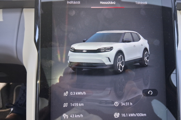Bő félezer kilométeren keresztül teszteltem az elektromos Ford Caprit, ebben volt egy oda-vissza Budapest-Szeged, a 130-as sztrádatempóval érdemben rontottam az utolsó nullázás utáni átlagfogyasztást. Ami még így is dicséretes: 1459 kilométerre 16,1 kWh volt a fogyasztás 43 km/óra átlagsebesség mellett. Visszafelé külön is mértem, kevés Szegeddel, reggeli csúcsos Budapesttel 165 kilométeren, 17,7 KWh lett a fogyasztás, 108 km/órás átlagtempó mellett. Néztem egy 40 kilométeres szegedi várost is, ez csupán 14,6 kWh fogyasztást produkált 30-as átlagsebesség mellett.