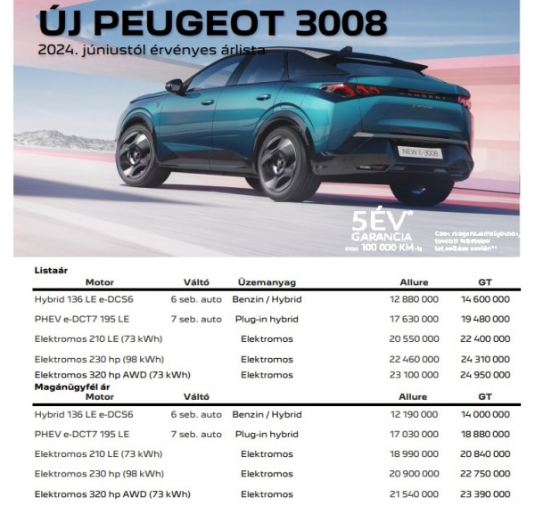 Kipróbáltuk az E-3008-at a teljesen elektromos változatot is, amiről később tervezünk írni. Elöljáróban annyi, hogy a mondott, publikált gyári hatótáv nem állhat messze a valóságostól. A teljesen villanyos Peugeot három változatban érkezik majd, lesz összkerekes változat is. Később érkezik majd a tölthető hibrid is a 3008-asból, ez is benne van már a hivatalos árlistában.