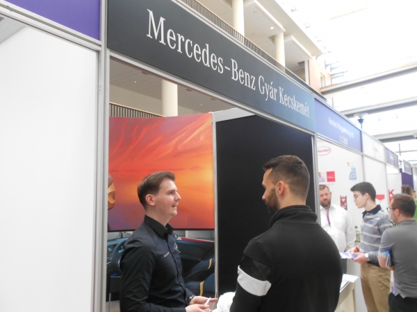 A csillagos márka magyarországi gyára elsősorban gyakornoki programjait ajánlotta az egyetemistáknak. Tette mindezt versenyképes juttatási csomaggal, a munkába járás költségeinek támogatásával és home office lehetőséggel. Az általános elvárások között felsorolták az idegennyelv ismeretet, a minimum 6 hónap vállalását és az aktív, nappali tagozatos hallgatói jogviszonyt. Az érdeklődők kezében nyomott szórólapon természetesen ott voltak a Mercedes aktuális nyitott pozíciói is – QR-kóddal. A cikk írásának percében ebből 20 is volt.