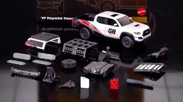 A Hot Wheels tervezője, Kevin Geraldez saját 2017-es Toyota Tacomáját zsugorította össze nyolc és fél centiméteres méretre. A duplafülkés, rövid platós pickupot (teljes hossz: 5392 mm, tengelytáv: 3571 mm) Kevin az évek során gondosan összeválogatott gyári kiegészítőkkel szerelte fel. Került rá mentődeszka, platófedél, dupla csomagtartó keret, tetősátor, pótkerék és marmonkanna a hátfalon, új lökhárítók, és persze egy sznorkel, hogy a 3,5 literes, 282 lóerős V6-os benzinmotor akkor se szívjon be vizet, ha épp egy gázlón kel át a pickup. A módosítások sorát speciális Eibach rugóstagokkal szerelt, emelt futómű, valamint ballonos terepabroncsok zárták.